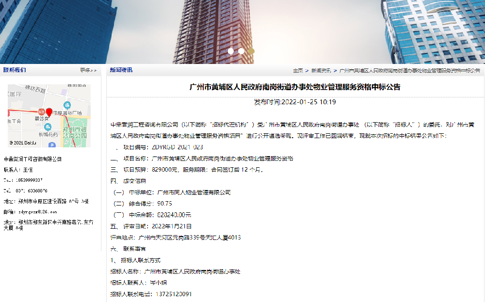 鼎點娛樂工程咨詢有限公司(以下簡稱“招標代理機構”)受廣州市黃埔區(qū)人民政府南崗街道辦事處 (以下簡稱“招標人”)的委托,對廣州市黃埔區(qū)人民政府南崗街道辦事處物業(yè)管理服務資格項目”進行公開遴選采購。現評審工作已圓滿結束,現就本次招標的中標結果公告如下:一、項目編號:ZDYRGD-2021-023二、項目名[詳細]